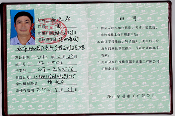 宇通重工操作證書